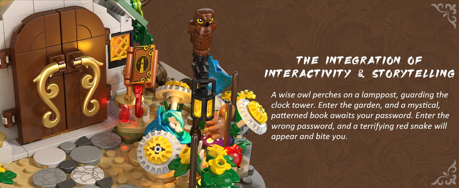 Dieser Uhrturm steht in einem mystischen Garten: Eine Eule blickt von einem Ast herab, eine schwarze Fledermaus hockt an der Wand, und das Zauberbuch am Eingang scheint uralte Magie zu bergen. Gibt man den falschen Code ein, schnellt eine rote Schlange hervor! Im Kammer des ersten Stocks findet man eine magische Truhe mit einem Zauberbuch und einem leuchtenden Zauberstab. Dieses Set, perfekt für Magieliebhaber und Bausteinsammler gleichermaßen, versetzt Sie in eine Welt voller Wunder – beginnen Sie noch heute Ihre magische Reise!
